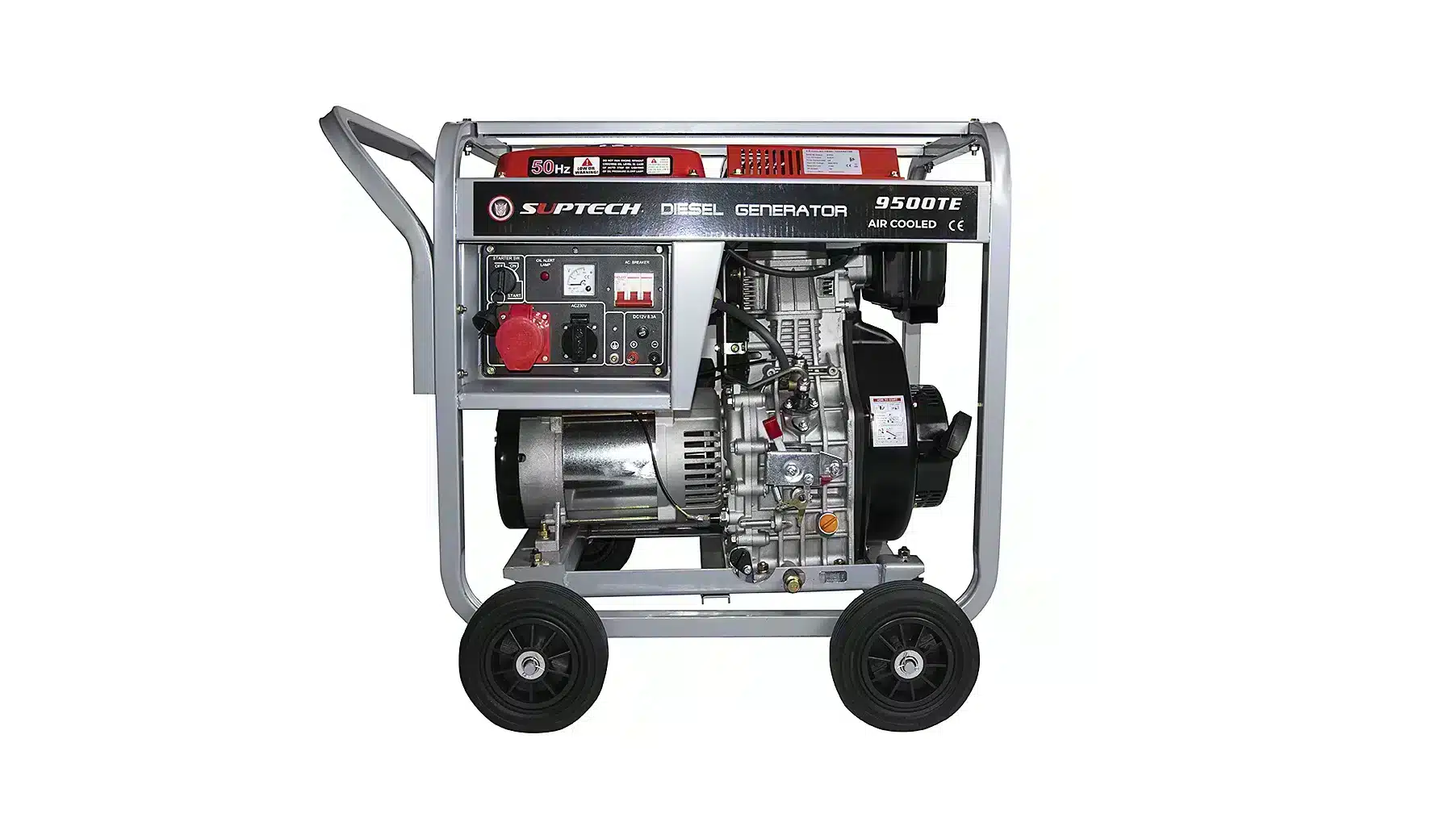 Dyzelinis generatorius SUPTECH 9500TE – galingas, tačiau labai kompaktiškas, lengvai transportuojamas rankenų ir ratukų pagalba. Dyzelinis generatorius su keturtakčiu varikliu gali būti naudojamas tiek sodo darbams, ūkyje, tiek statybose. Tai labai tvirtas, kokybiškas ir galingas generatorius su 100% varinėmis apvijomis. Šio įrenginio variklis turi alyvos lygio indikatorių, itin nesudėtingą elektrinį paleidimą ir puikiai funkcionuoja nepriklausomai nuo darbo temperatūros sąlygų. Dėl galios, mobilumo ir funkcionalumo, šį generatorių pamėgs kiekvienas!