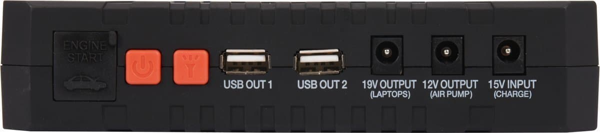 - Įkrovimo prietaisas: Turi 2 USB 5 V / 2,4 A išėjimus, kuriais galite įkrauti mobiliuosius įrenginius (pvz., telefonus, ausines, fotoaparatus). Taip pat galėsite pasikrauti, pavyzdžiui, nešiojamuosius kompiuterius, kadangi baterijoje integruotas ir 19 V išėjimas.